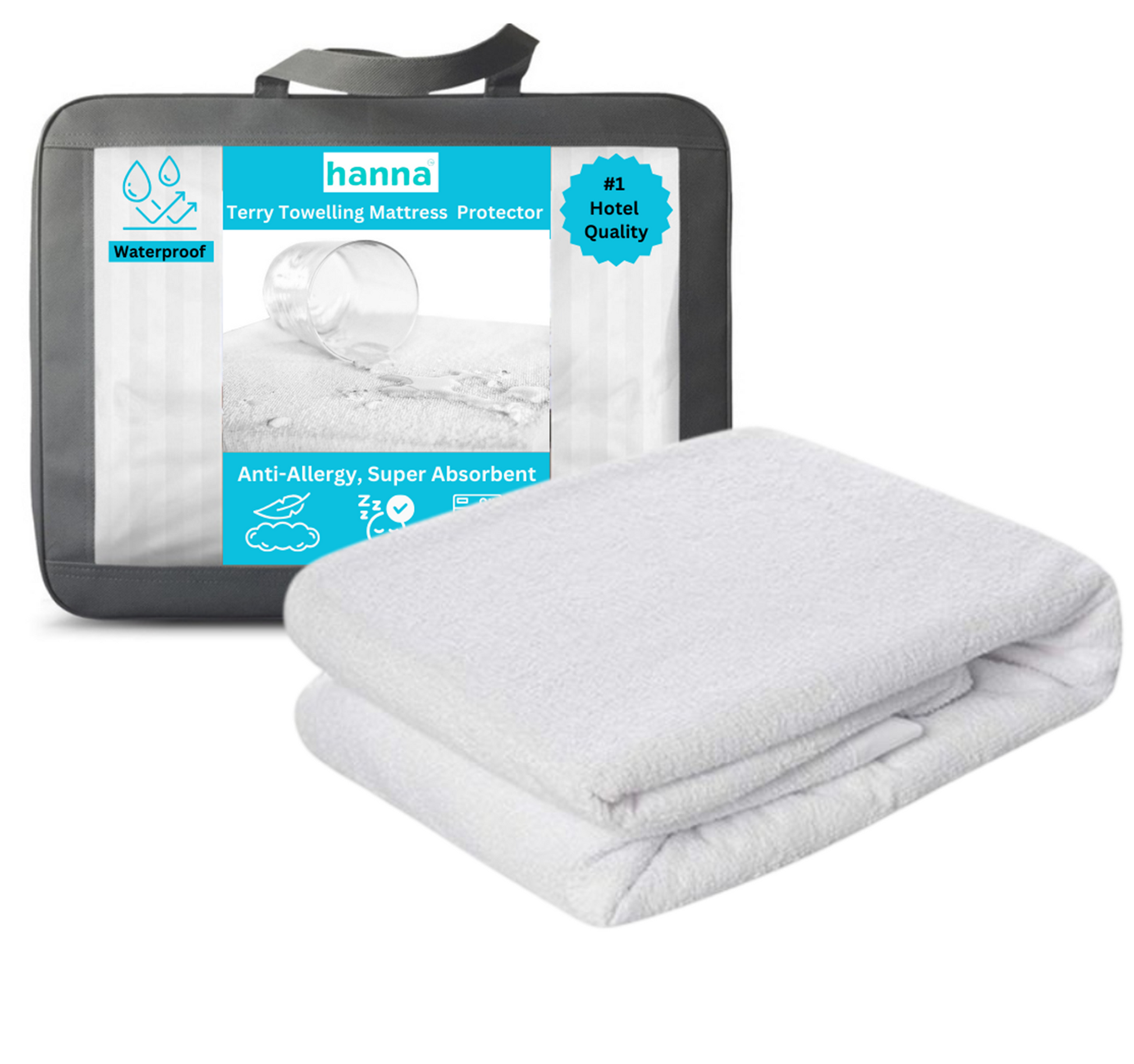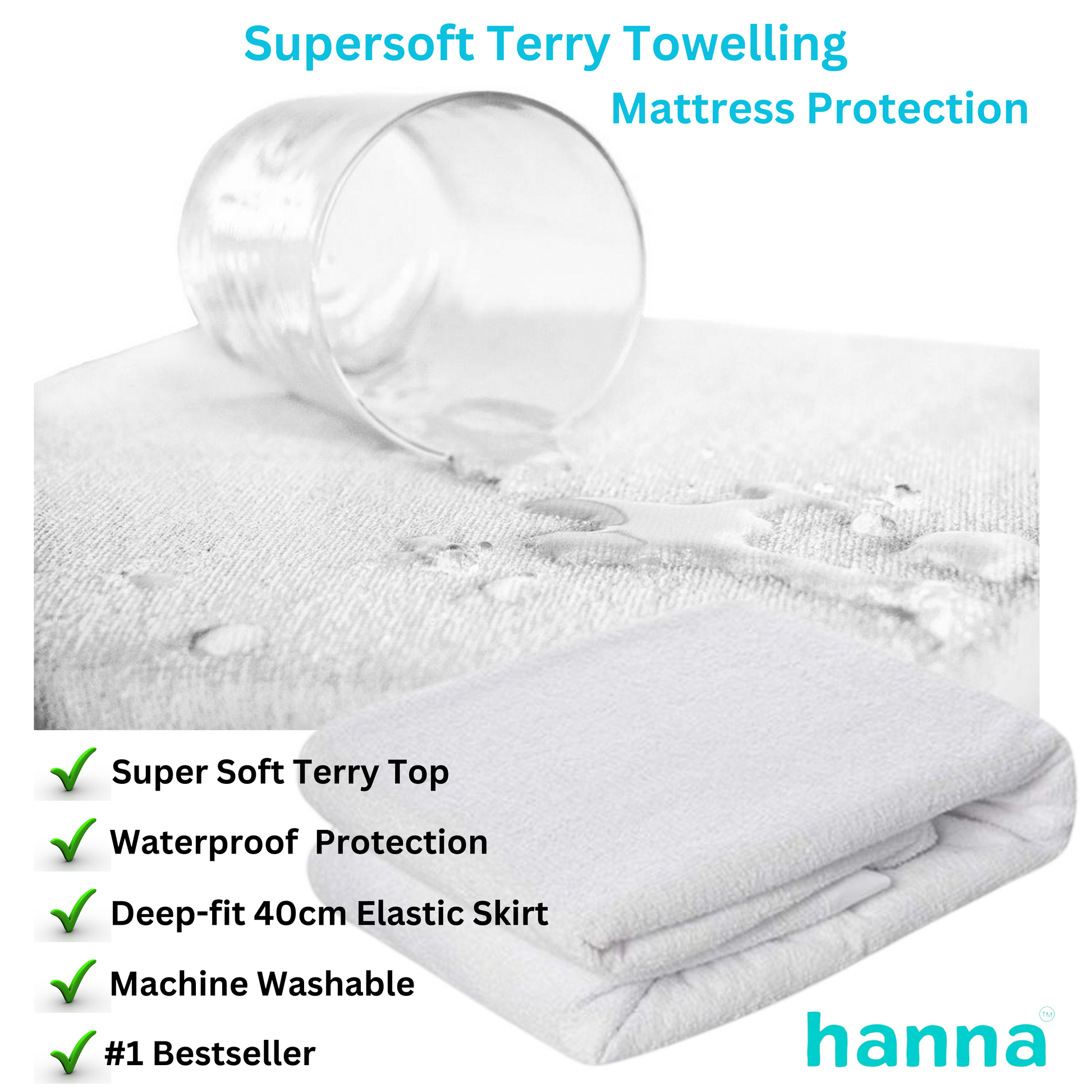 New Season! Hanna's 100% Waterproof Terry Towelling Cotton Mattress Protector, with an extra deep 40cm fitted skirt and classic terry towelling soft top finish.