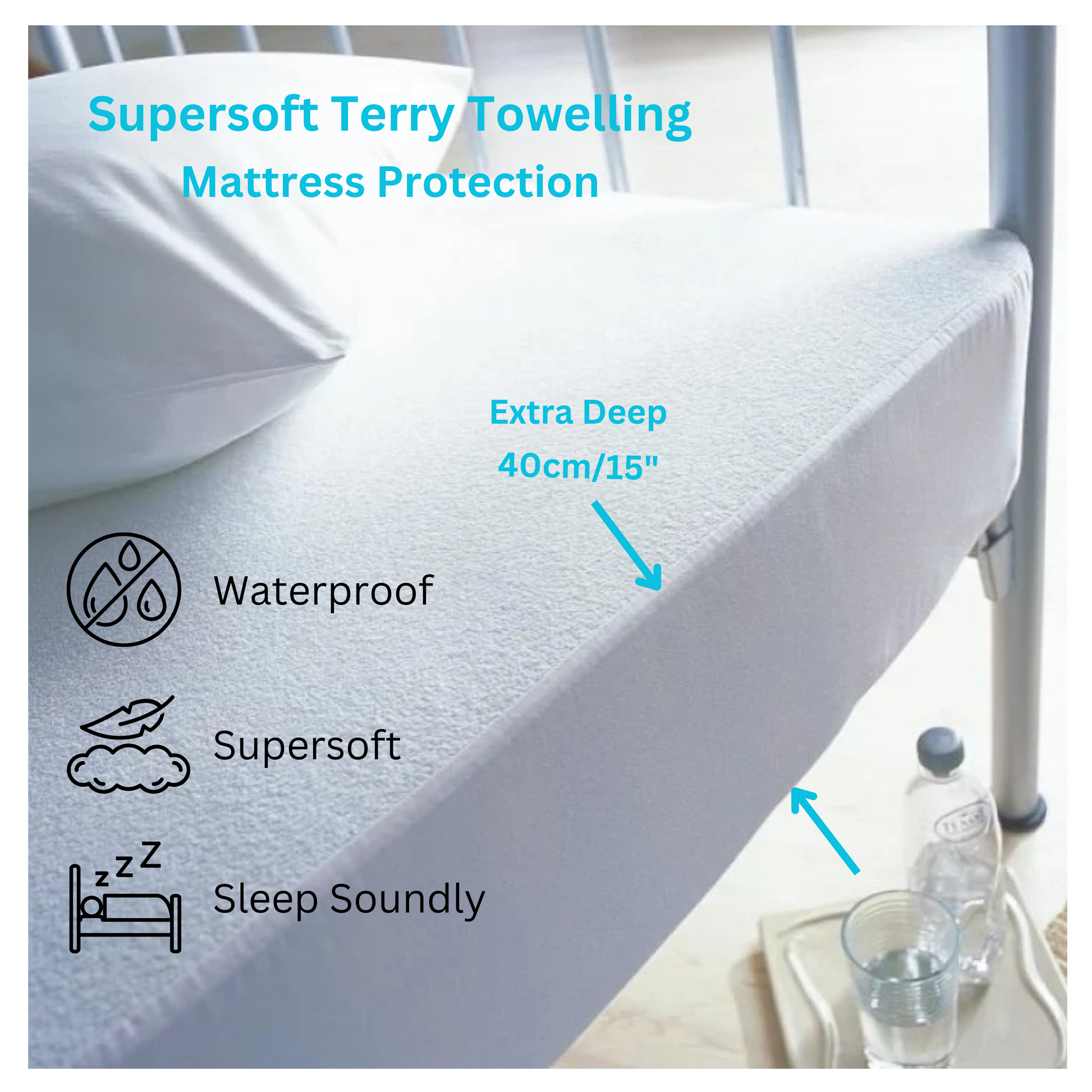 Frequently requested and now in stock is our Waterproof Terry Towelling Cotton Mattress Protectors. Featuring an extra-deep 40cm fitted skirt that stays perfectly in place on your mattress, no matter how much you toss and turn!